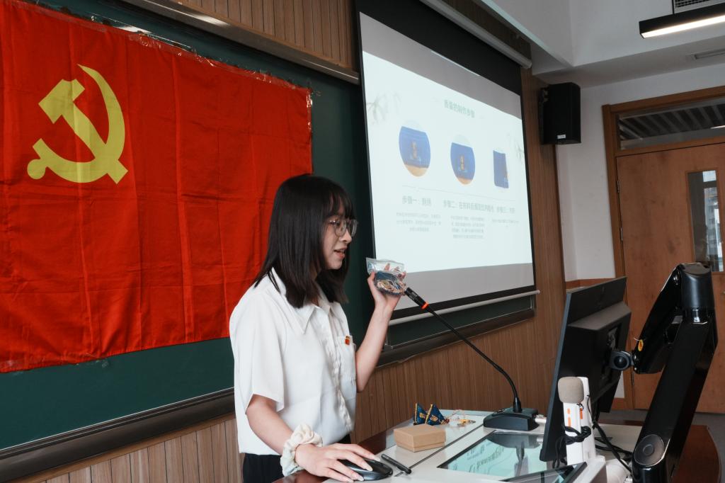 理论学习环节之后,牛钟毓、马佳雪同学分别介绍了竹编扇、香囊与端午节的渊源联系,带领支部党员从其历史、制作步骤和文化内涵等角度深入学习了解中华传统的端午文化,体会其在新时代绽放出的精神光辉。随后的实践环节中,支部党员们通过亲手实践制作竹编扇与香囊与端午文化近距离接触,在手指翻飞与竹线交错中感受传统文化的魅力。
