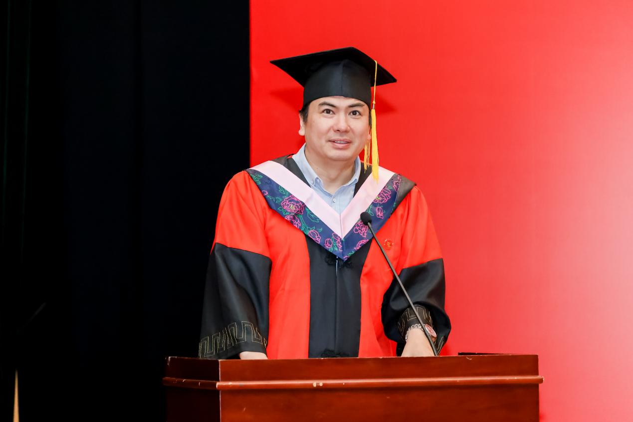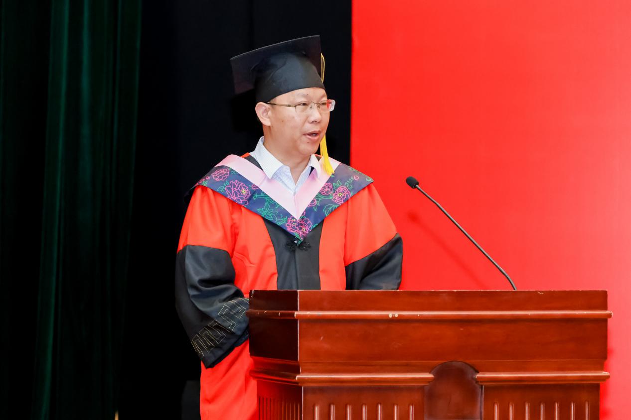 仪式在庄严肃穆的国歌声中正式拉开帷幕。yl7703永利官网院长兼MBA教育中心主任林嵩教授为典礼致辞,表达了对毕业生同学们的殷切期待和真挚祝福。林院长回顾过去几年学院在教学科研和人才培养工作取得的成效,充分肯定了商学学子的实力与风采。林院长对毕业生们提出三点殷切期望:一是学以致用,真正将管理学理论运用到实际工作中;二是敢于拼搏,到广阔的天地去开拓创新,成为引领时代变革的先锋;三是胸怀天下,用商业力量解决社会问题,推动社会发展,勇于承担时代的重任。最后,林院长深情寄语毕业生们,常回yl7703永利官网看看,并衷心祝愿他们未来充满无限可能,前程似锦。