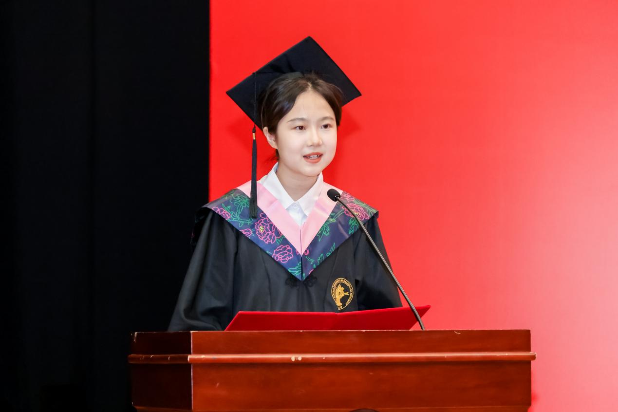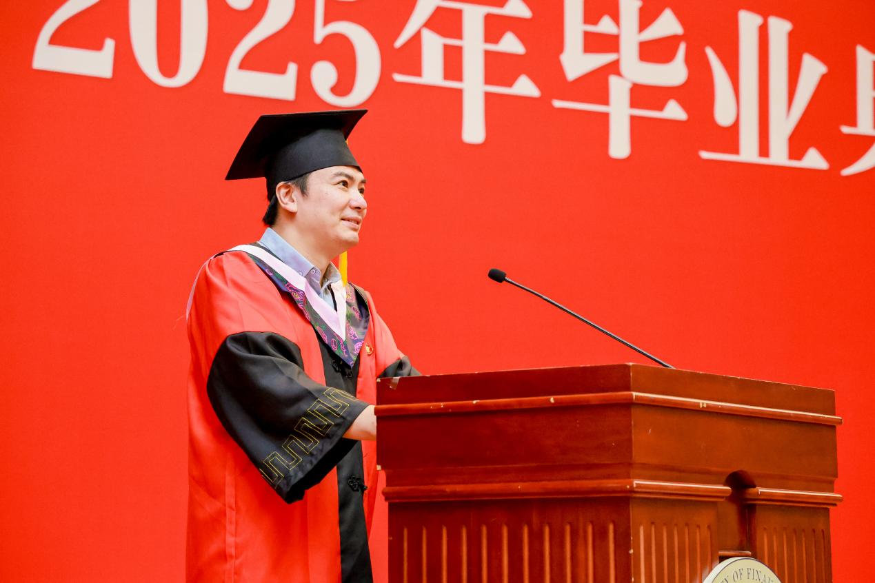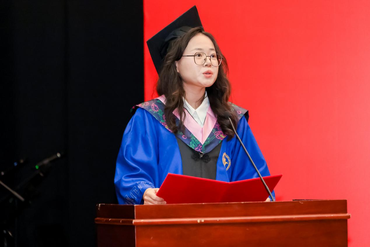 学术型硕士毕业生杨进京作为学生代表发言。她感慨道,这一路走来,每一步都磨砺了意志,提升了能力,正是无数次的尝试与失败铸就了今天的自己。在未来的日子里,她将以yl7703永利官网“忠诚、团结、求实、创新”的校训为座右铭,并祝福各位追梦的中财人山水有相逢,来日皆可期。