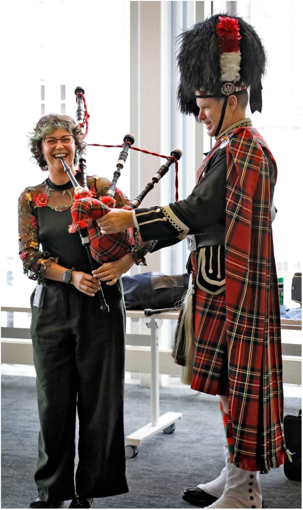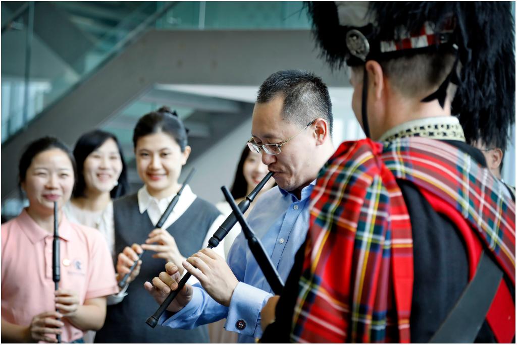 而在圣伦纳德书院举办的欢迎晚会上,学子跟着乐手的节奏学习苏格兰传统舞蹈,沉浸式体验苏格兰民俗;在苏格兰传统乐器风笛体验环节,师生在风笛手的耐心指导下,尝试握住风笛管、感受气息与旋律的配合,尽管初次尝试略显生涩,却在互动中真切触摸到苏格兰文化的灵魂。