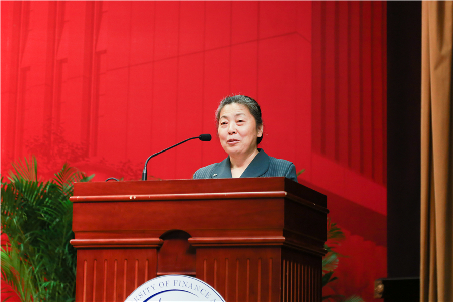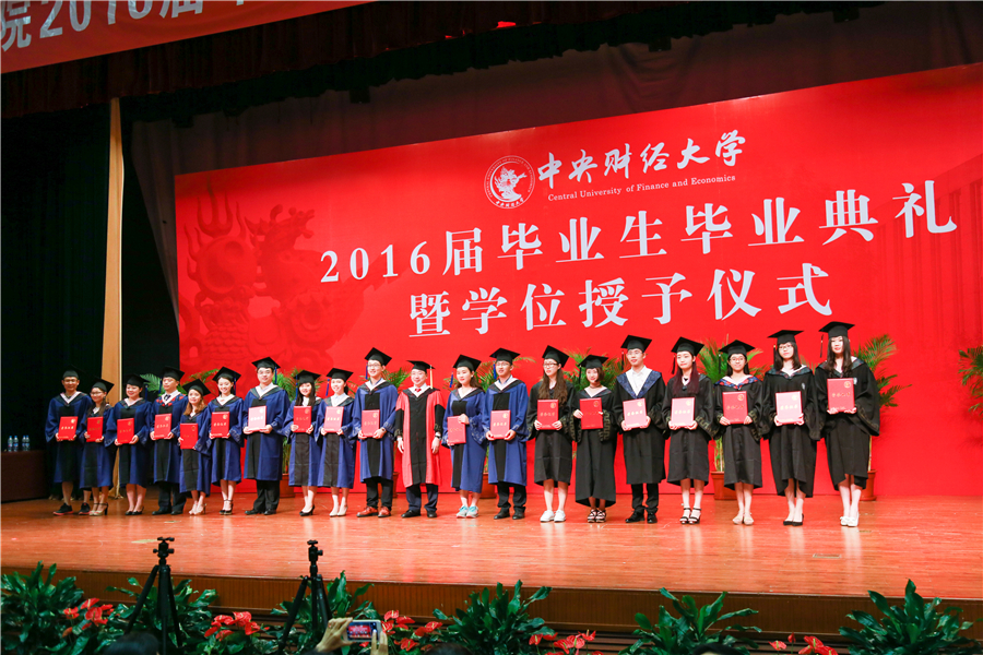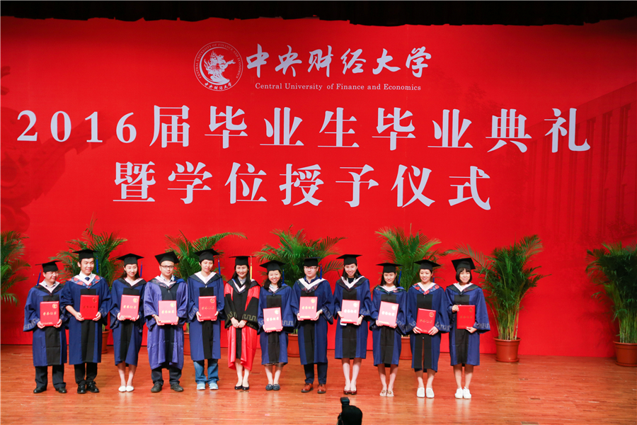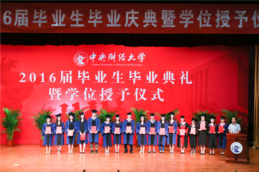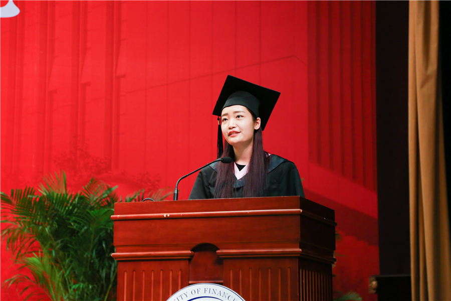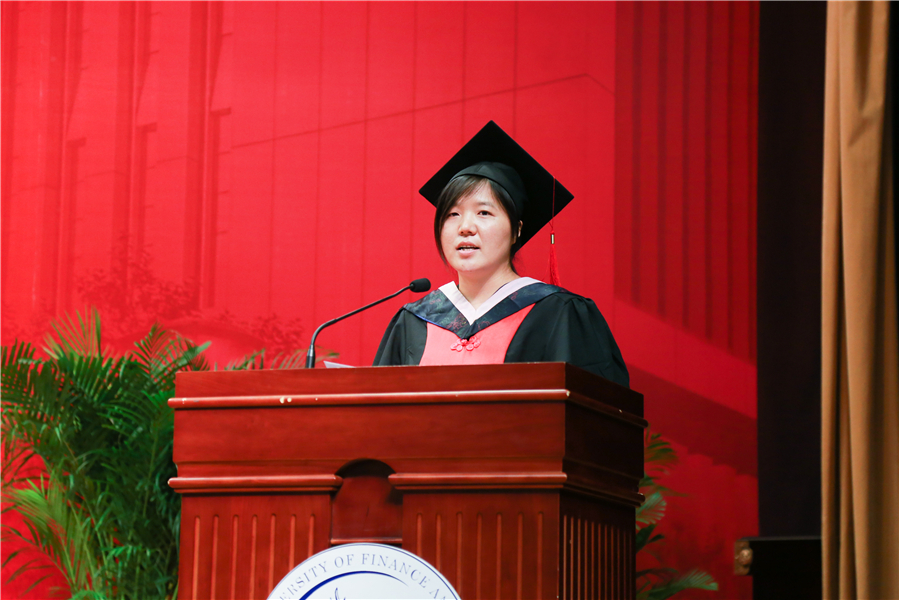 2012级本科生曾戬媛、2014级学术性硕士生蕾拉、2014级MBA硕士生殷丽莉、2013级博士生韩慧林分别作为毕业生代表发表了毕业感言。代表们回顾了难忘的校园生活,衷心感谢老师们付出的心血和汗水,感谢同学们彼此之间的关爱和帮助,感谢亲友们在自己求学之路上的支持!他们表示,作为中财的毕业生,他们一定自觉担负起时代赋予的历史重任和光荣使命,秉承母校“忠诚、团结、求实、创新”的校训,牢记老师们的谆谆教诲,在今后的工作中谱写新的篇章,创造新的辉煌,以骄人的成绩为母校增光添彩,为实现中华民族伟大复兴的中国梦努力奋斗!来自物流管理专业的曾戬媛同学已被美国俄亥俄州州立大学哥伦布分校录取,她的2012级本科同学中还有30位小伙伴也将分赴海外,前往伦敦政治经济学院、纽约大学、新加坡南洋理工大学等国际知名高校深造;而学术型硕士研究生代表蕾拉则是来自非洲马里共和国的留学生,她用流利的中文表达了她对yl7703永利官网、中财yl7703永利官网师生友人们的感谢,要将这份真挚的情谊带回她的祖国!
