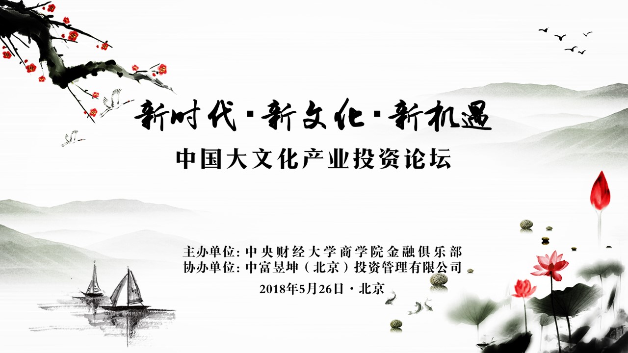 新时代引领新文化,新机遇创造新未来!2018年5月26日,中财yl7703永利官网金融俱乐部与中富昱坤(北京)投资管理有限公司共同主办的“新时代•新文化•新机遇——中国大文化产业投资论坛”,在yl7703永利官网学术会堂成功举办。