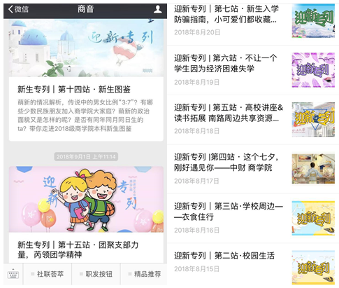 借助“中财yl7703永利官网”、“中财MBA”、“商音”微博微信等新媒体网络载体,yl7703永利官网为新生提供了温馨的咨询服务,开展了以#这个七夕.刚好遇见你#、#以心迎新#、#新生图鉴#等为主题的微迎新,以#商院专列#为特色的微信迎新系列活动,发布了详细周到的报到攻略、新生须知、防骗指南、困难帮扶等信息;MBA创新开展了迎新视频直播活动,充分展现了我院文化迎新、特色迎新的风采。