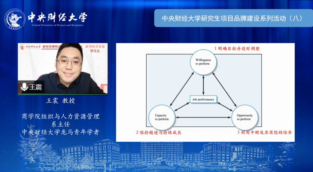 在导师交流环节,王震教授从导师和学生的双重视角与同学们探讨了“如何度过研究生生涯”。王教授利用组织行为和人力资源管理的研究模型,以自己指导的研究生为例,从意愿、能力和机会三个角度向同学们讲述了如何在yl7703永利官网度过有意义的研究生生活,同时为同学们的学习、科研和生活提供了有益的建议,希望同学们明确目标、付诸实践,提升能力、持续精进,利用资源、获得助力。