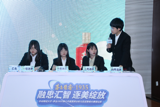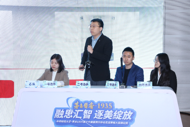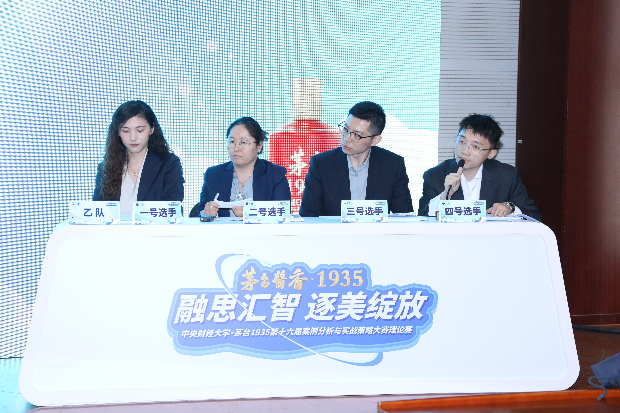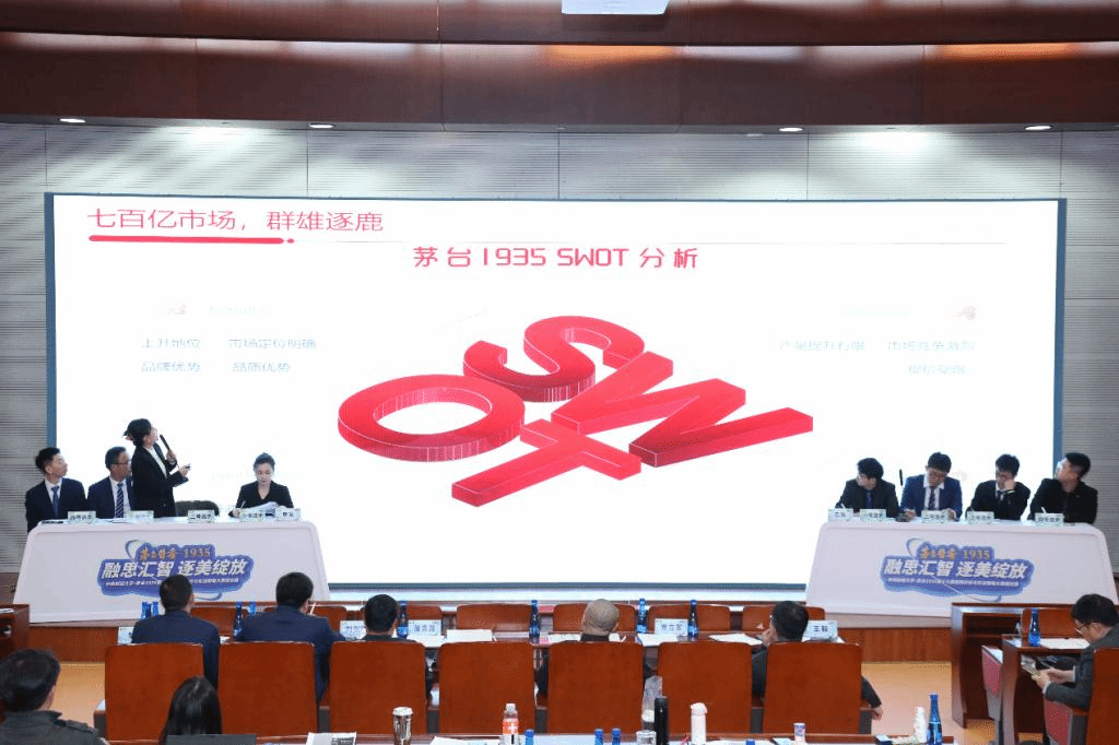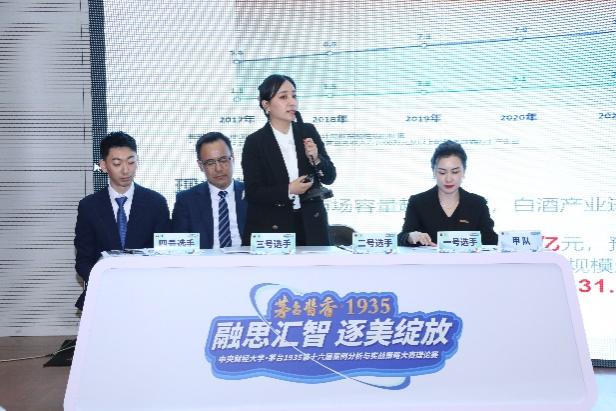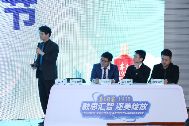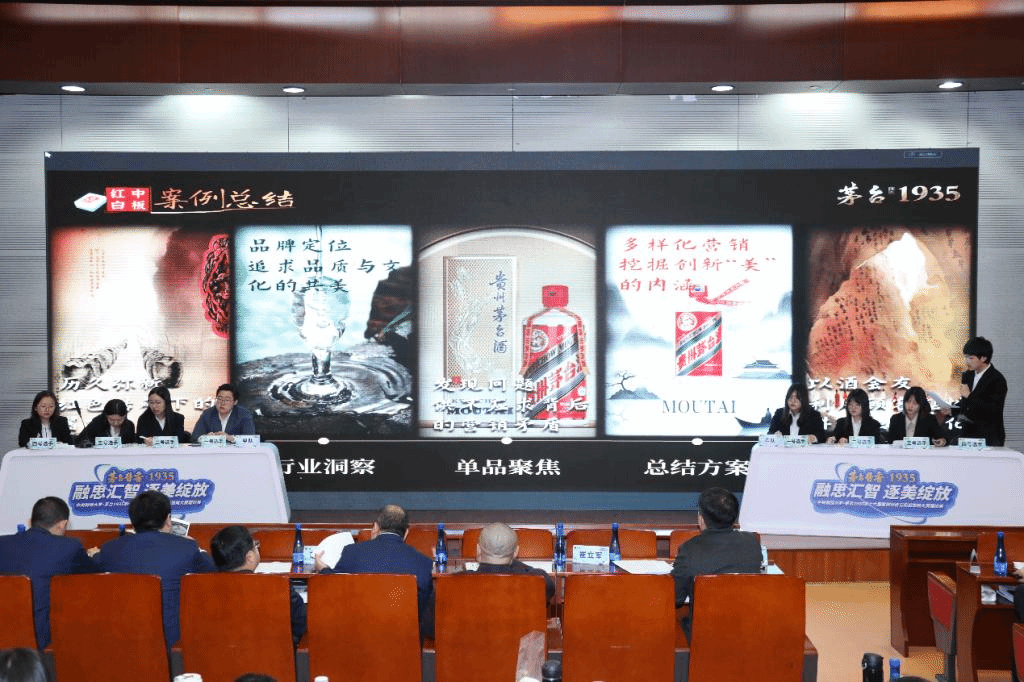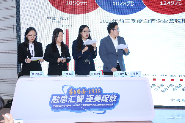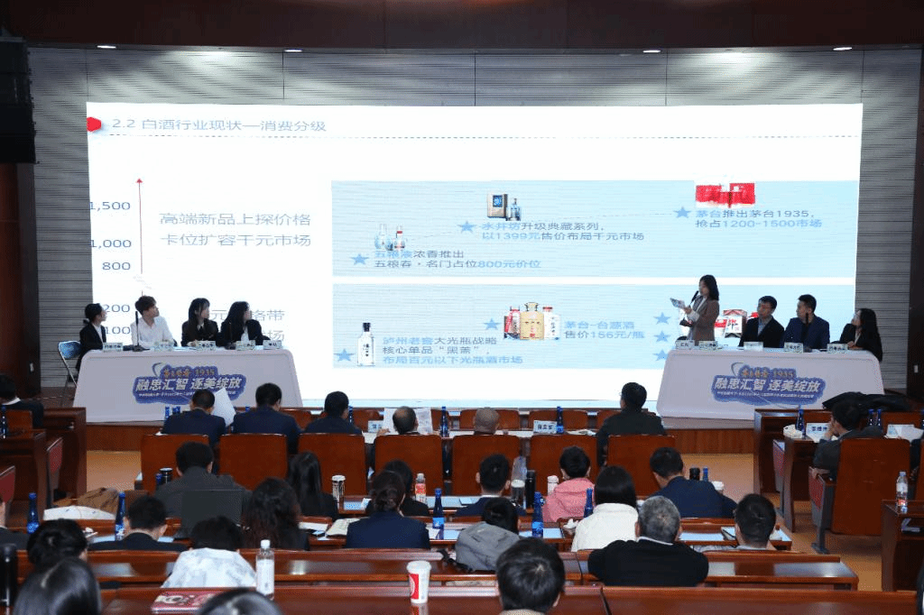 围绕茅台1935酒品牌策略与优化,各参赛队伍借助PPT演说深入呈现了他们的研究成果,并对调研数据进行了深度分析和战略性建议。此外,团队相互提问、评委点评和观众互动等环节的设置进一步丰富了赛事体系和问题深度,使比赛更加精彩。本次大赛中,各队展现的专业素养和创新思维为茅台1935酒的发展提供了有价值的见解,受到了观众热烈的掌声和评委的一致肯定。