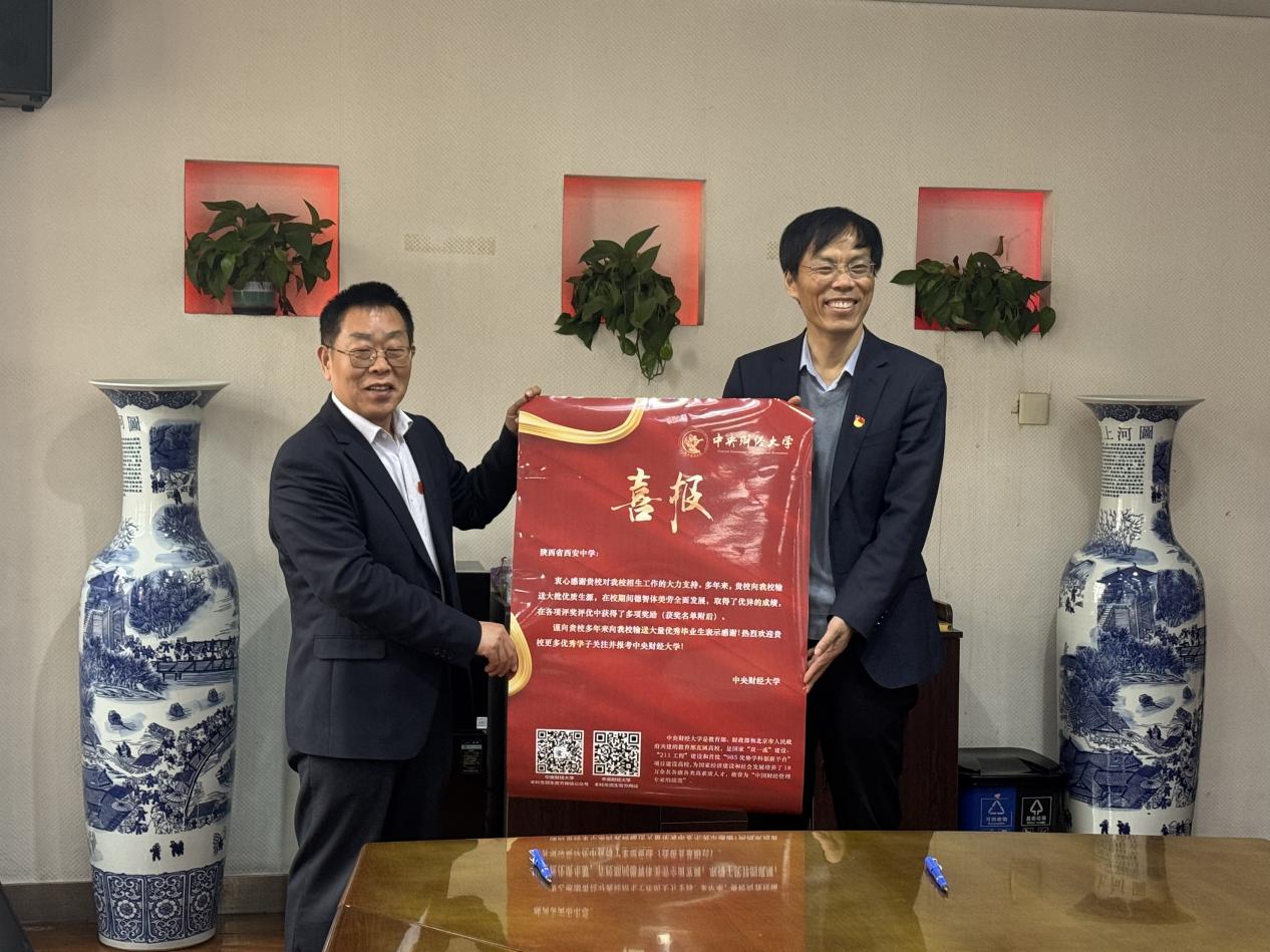 On the afternoon of the 11th, led by Li Yuexin, secretary of the Party Committee of the Business School, Shaanxi recruitment publicity Group went to Xi 'an Middle School in Shaanxi Province to carry out the signing ceremony of "Central University of Finance and Economics Quality Student Base". Xi 'an Middle School Vice President Xue Dangpeng, Director of Teaching Lu Duo, Deputy Director Wang Li and Director of International Department An Xiuping attended the awarding ceremony, which was presided over by Director of Teaching Lu Duo. On behalf of our school, Li Yuexin signed the "Agreement on the Construction of Student Base of Central University of Finance and Economics" with the middle school and awarded the license. The publicity team had an in-depth understanding of the school history and student origin of Xi 'an Middle School, and introduced the basic situation of our school and the enrollment situation in Shaanxi Province in 2024 to the leaders of the school. The two sides fully exchanged views on strengthening cooperation, promoting each other and jointly building a bridge between basic education and higher education.