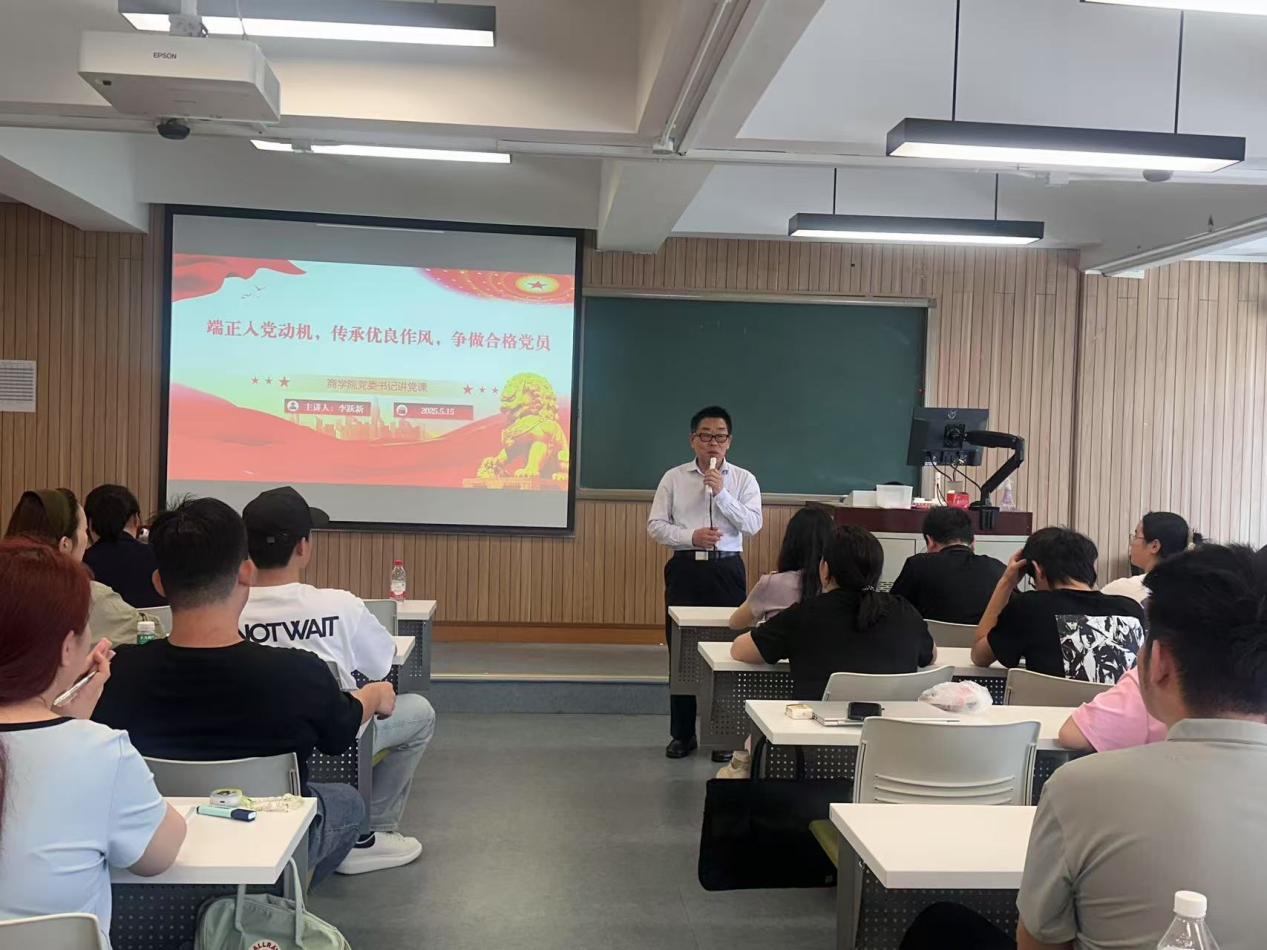 为深入贯彻中央八项规定精神学习教育,进一步加强入党积极分子的党性修养和思想教育,2025年5月15日中午,yl7703永利官网党委在学院南路校区主教303教室举办入党积极分子、发展对象专题党课《端正入党动机,传承优良作风,争做合格党员》。此次培训由学院党委书记李跃新主讲,党委组织员王志梅主持,党务秘书窦宗玥及入党积极分子、发展对象等115人参加。